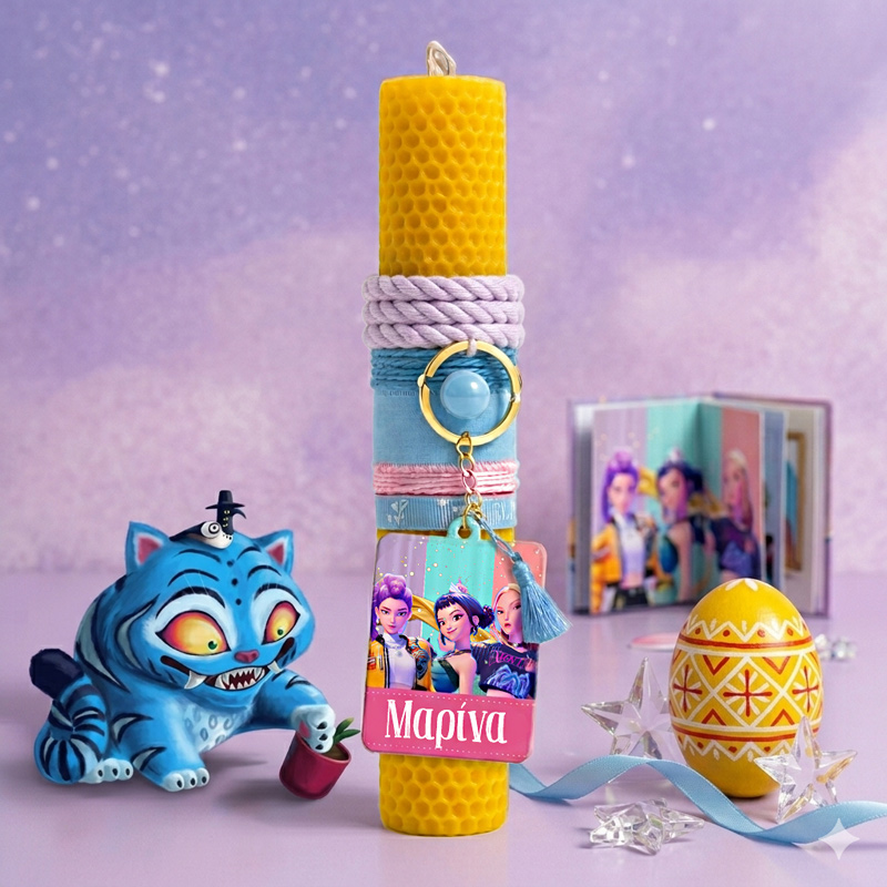 Βρες εδώ μια πανέμορφη λαμπάδα από μελισσοκέρι με προσωποποιημένο μπρελόκ με τις Kpop demon hunters Huntrix και κάνε το πιο όμορφο δώρο με μια λαμπάδα από φυσικό κερί!