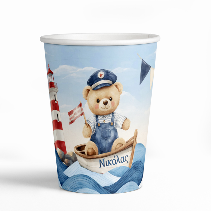 Ποτηράκια με το όνομα του μικρού σας και θέμα Ναυτικό Αρκουδάκι, για να κεράσετε τους καλεσμένους σας στο τραπέζι του πάρτυ ή της βάπτισης!