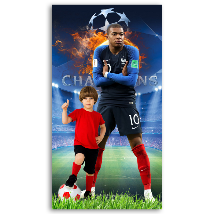 Μεγάλη διακοσμητική αφίσα με θέμα τον αγαπημένο ποδοσφαιριστή Kylian Mbappéκαι εκτυπωμένη τη φωτογραφία του παιδιού, για να υποδεχθείτε τους καλεσμένους σας στο πάρτυ γενεθλίων ή για να διακοσμήσετε το δωμάτιό του!