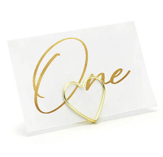 - Περιλαμβάνονται 10 καρτελάκια από περλέ χαρτί 250g και 10 χρυσές μεταλλικές βάσεις σε σχήμα καρδιάς (αριθμοί 1 έως 10)