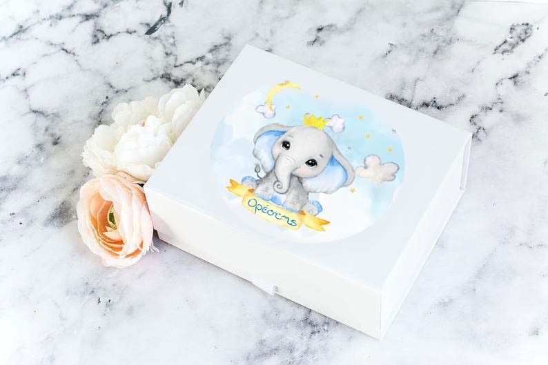 Στρογγυλά προσωποποιημένα αυτοκόλλητα με το Ελεφαντάκι. Μπορείτε να τα χρησιμοποιήσετε σε κουτάκια μπομπονιέρας, σε μπουκάλια και ποτήρια ή σε οποιοδήποτε άλλο αντικείμενο θέλετε να διακοσμήσετε για τη βάπτιση ή το πάρτυ.