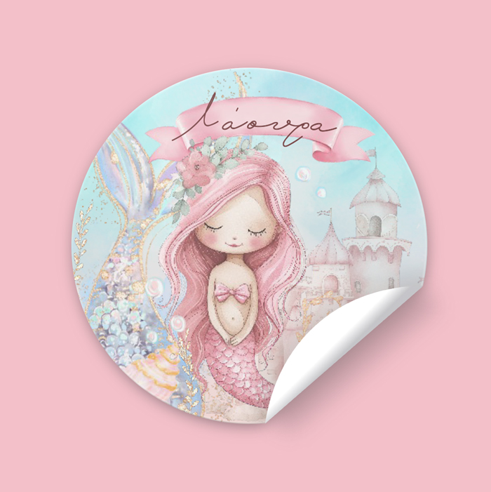 Στρογγυλά προσωποποιημένα αυτοκόλλητα με θέμα Ροζ Γοργόνα (6 τεμ). Μπορείτε να τα χρησιμοποιήσετε σε κουτάκια μπομπονιέρας, σε μπουκάλια και ποτήρια ή σε οποιοδήποτε άλλο αντικείμενο θέλετε να διακοσμήσετε για τη βάπτιση ή το πάρτυ.