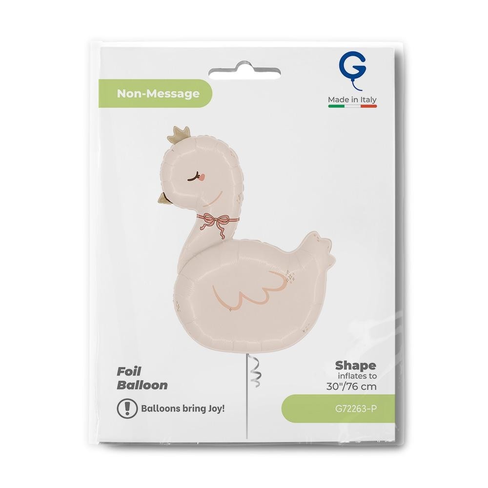 Χαριτωμένο μπαλόνι σε σχήμα κύκνου, με μικρή κορώνα και φιογκάκι, σε απαλά κρεμ χρώματα. Ιδανικό για baby shower, βαπτίσεις ή θεματικά πάρτι, προσθέτοντας κομψότητα και γλυκιά διάθεση στη διακόσμηση.