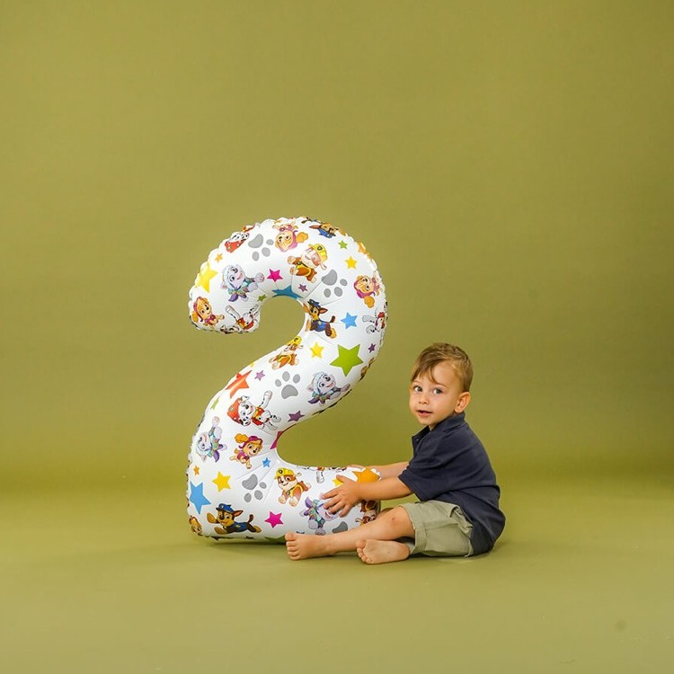 Μεγάλο foil μπαλόνι σε σχήμα αριθμού 2, με θέμα την αγαπημένη παρέα των Paw Patrol, ιδανικό για παιδικά γενέθλια και θεματική διακόσμηση που ξεχωρίζει σε κάθε πάρτι και φωτογραφία.