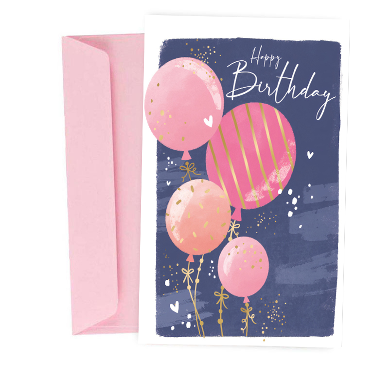 Ευχετήρια κάρτα γενεθλίων με Ροζ Μπαλόνια σε φόντο midnight blue για να ευχηθείς με τον πιο γλυκό τρόπο στους αγαπημένους σου!