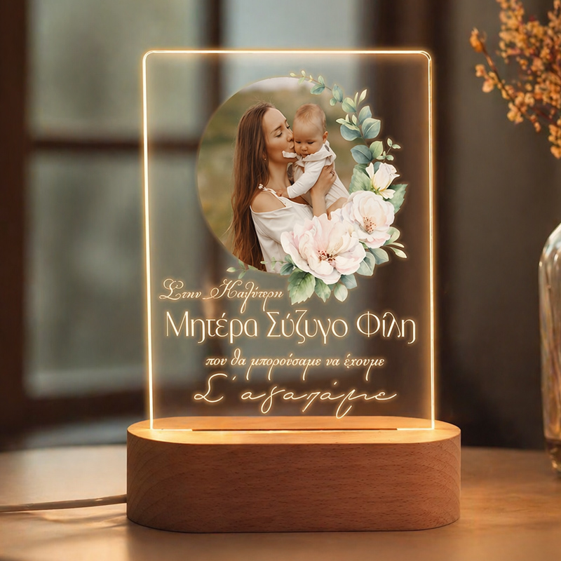 Φωτιστικό LED με προσαρμοσμένο κείμενο, Φωτογραφία της επιλογής σου και φωτιζόμενη βάση, για να κάνεις δώρο στην αγαπημένη σου μαμά και να της δείξεις πόσο ξεχωριστή είναι για σένα.