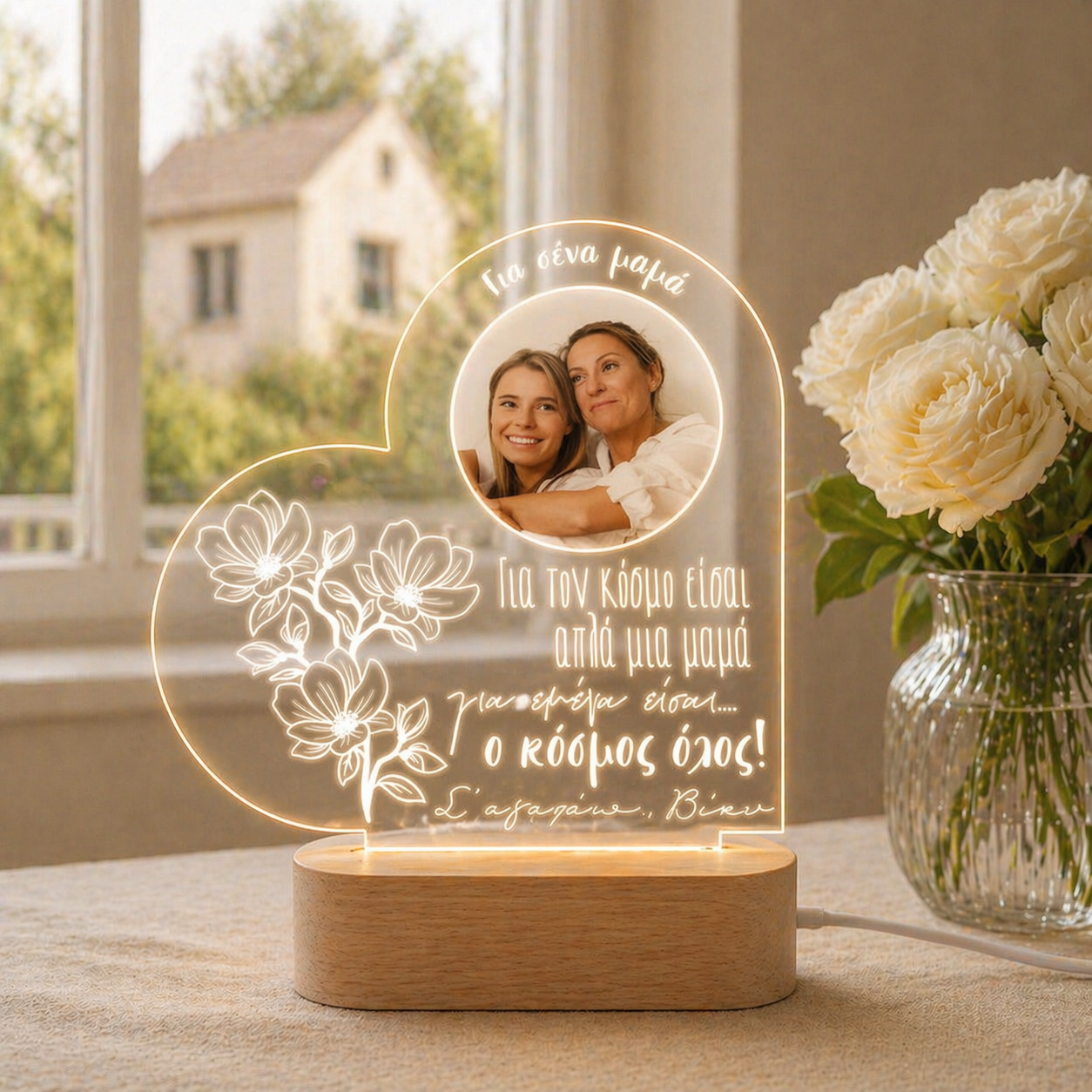 Φωτιστικό LED καρδιά με προσαρμοσμένο κείμενο, Φωτογραφία της επιλογής σου και φωτιζόμενη βάση, για να το κάνεις δώρο στην αγαπημένη σου μαμά και να της δείξεις πόσο ξεχωριστή είναι για σένα.