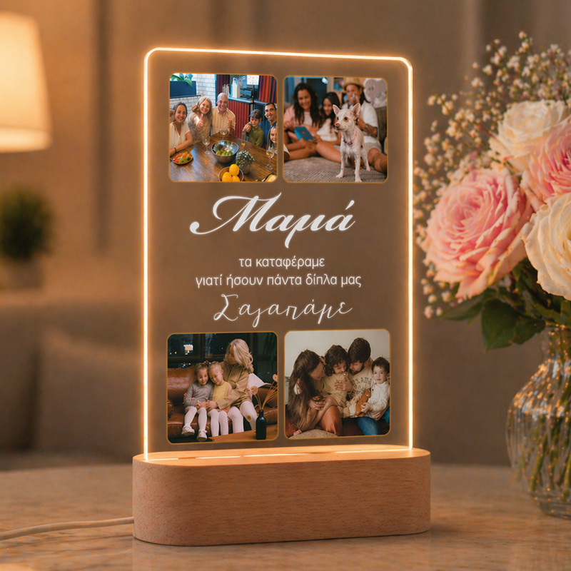Φωτιστικό LED με προσαρμοσμένο κείμενο, 4 Φωτογραφίες της επιλογής σου και φωτιζόμενη βάση, για να κάνεις δώρο στην αγαπημένη σου μαμά και να της δείξεις πόσο ξεχωριστή είναι για σένα.