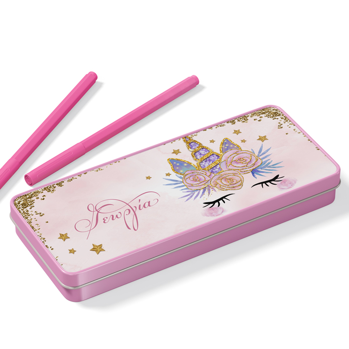 Μεταλλική κασετίνα με σχέδιο Μονόκερο και τυπωμένο το όνομα! Βάλε σ’αυτή τα αγαπημένα σου σχολικά αντικείμενα ή δώρισέ την σε μια φίλη σου και ξεχωρίστε στην τάξη!