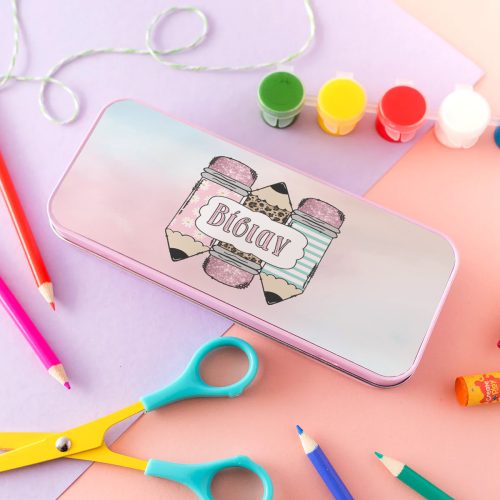 Μεταλλική κασετίνα με σχέδιο ροζ-χρυσό γκλίτερ και τυπωμένο το όνομα! Βάλε σ’αυτή τα αγαπημένα σου σχολικά αντικείμενα ή δώρισέ την σε μια φίλη σου και ξεχωρίστε στην τάξη!