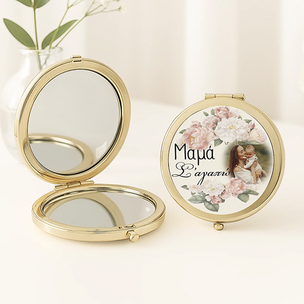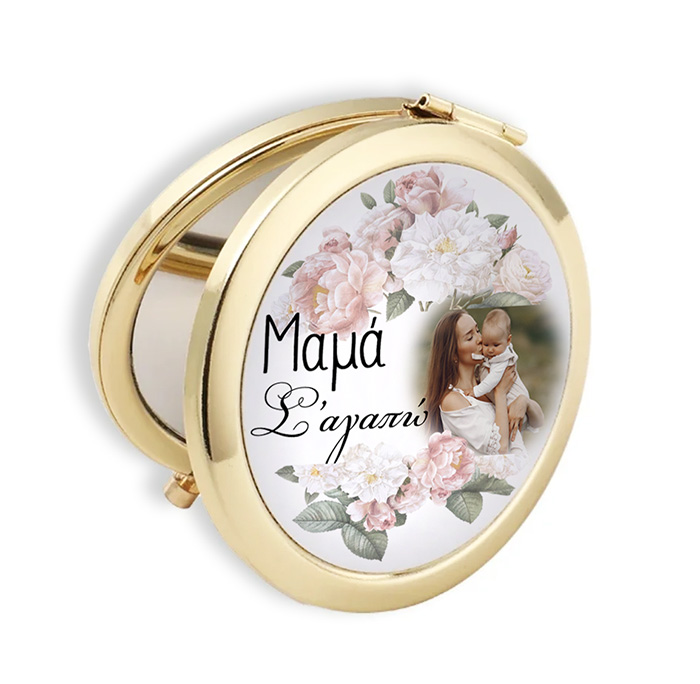 Μεταλλικό καθρεφτάκι στρογγυλό που ανοίγει, σε χρυσό χρώμα και την φωτογραφία της επιλογής σου για να το χαρίσεις ως δώρο στην αγαπημένη σου μαμά!