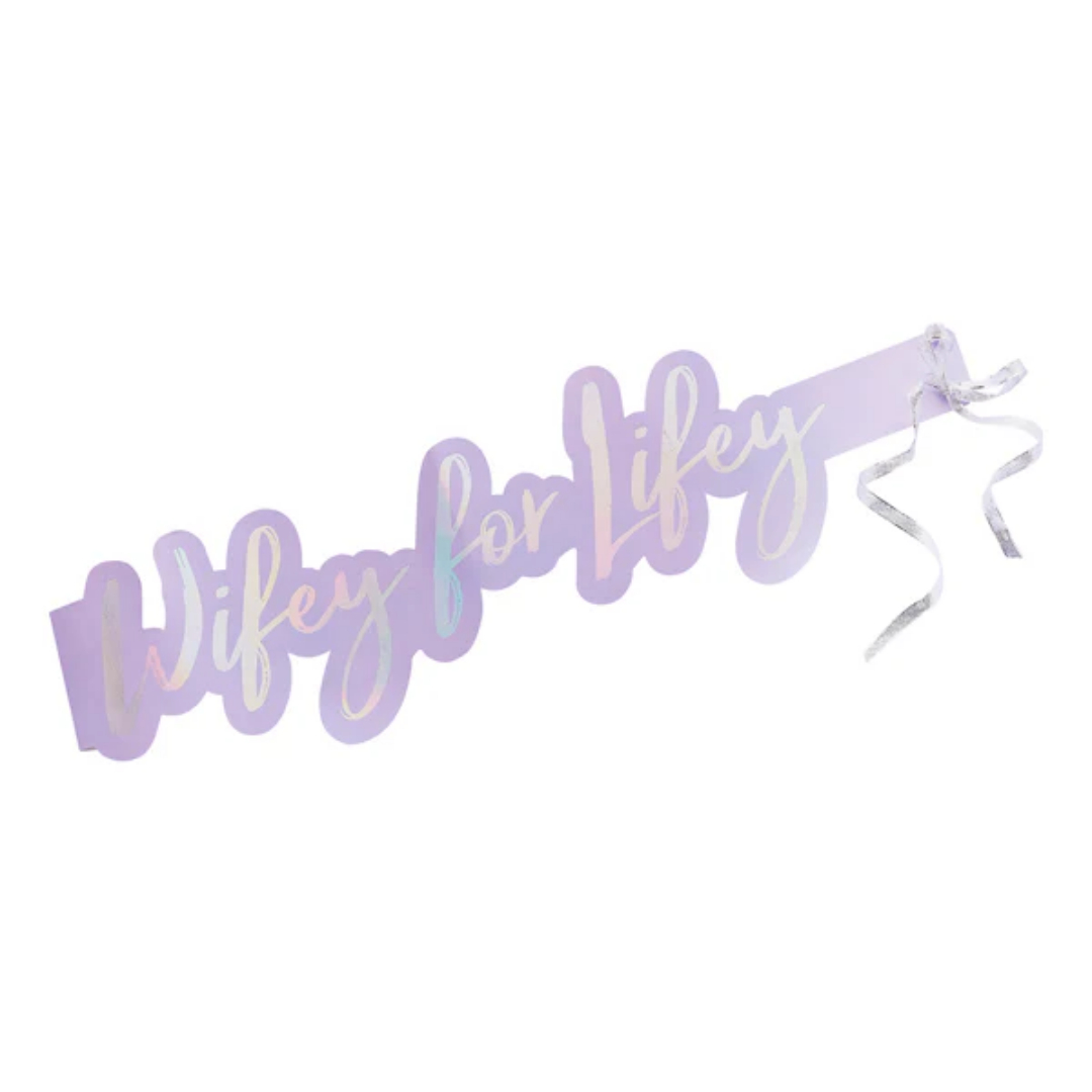 Όλοι θέλουν να ξέρουν ποια είναι η μέλλουσα νύφη! Κορδέλα “Wifey for Lifey” σε λιλά χρώμα με ιριδίζοντα γράμματα, για να φορέσει η νύφη στο Bachelorette party ή στο pre-wedding πάρτυ!