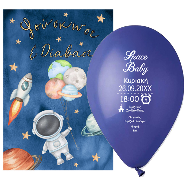Πρωτότυπο προσκλητήριο βάπτισης σε τυπωμένο μπαλόνι με θέμα Αστροναύτης. Οι καλεσμένοι θα πρέπει να φουσκώσουν το τυπωμένο μπαλόνι για να μάθουν τις λεπτομέρειες της βάπτισης!