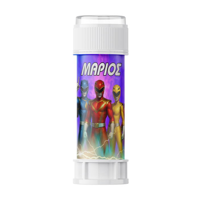 Προσωποποιημένες σαπουνόφουσκες με χάρτινο περιτύλιγμα και θέμα Power Rangers, για να χαρίσετε ως αναμνηστικό δωράκι στους μικρούς καλεσμένους του πάρτυ.