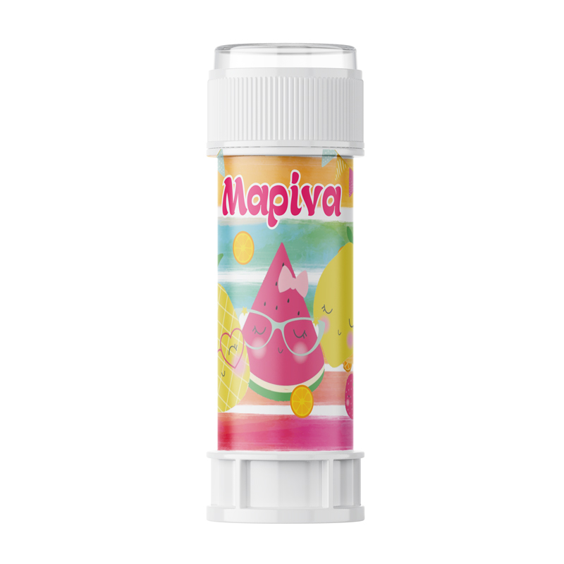 Προσωποποιημένες σαπουνόφουσκες με χάρτινο περιτύλιγμα και θέμα Tutti Frutti, για να χαρίσετε ως αναμνηστικό δωράκι στους μικρούς καλεσμένους του πάρτυ.