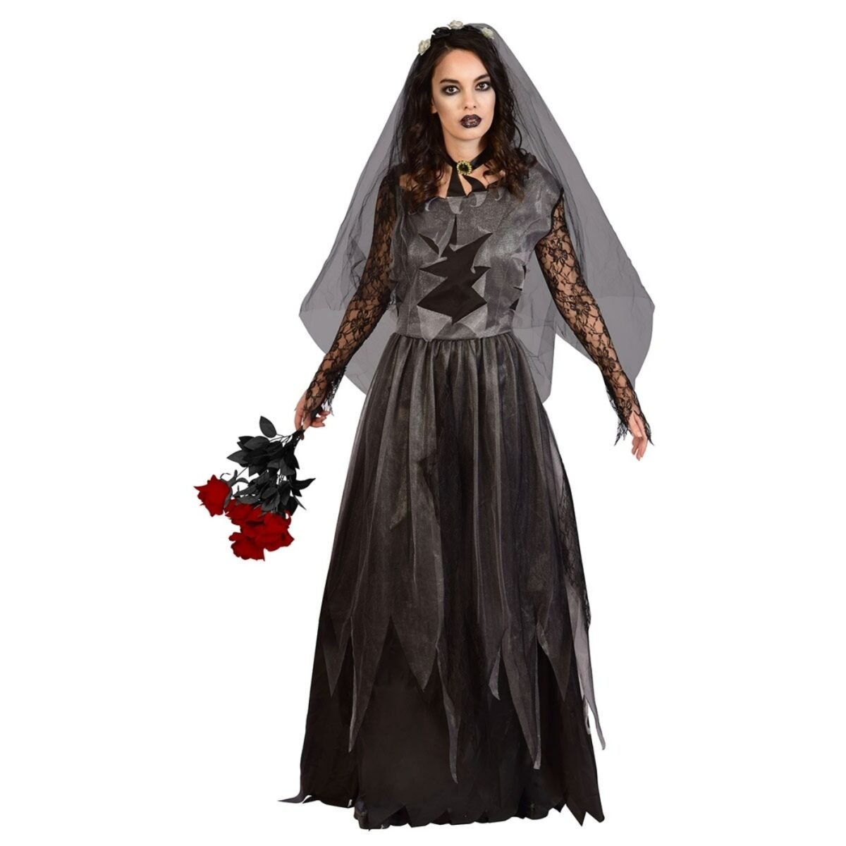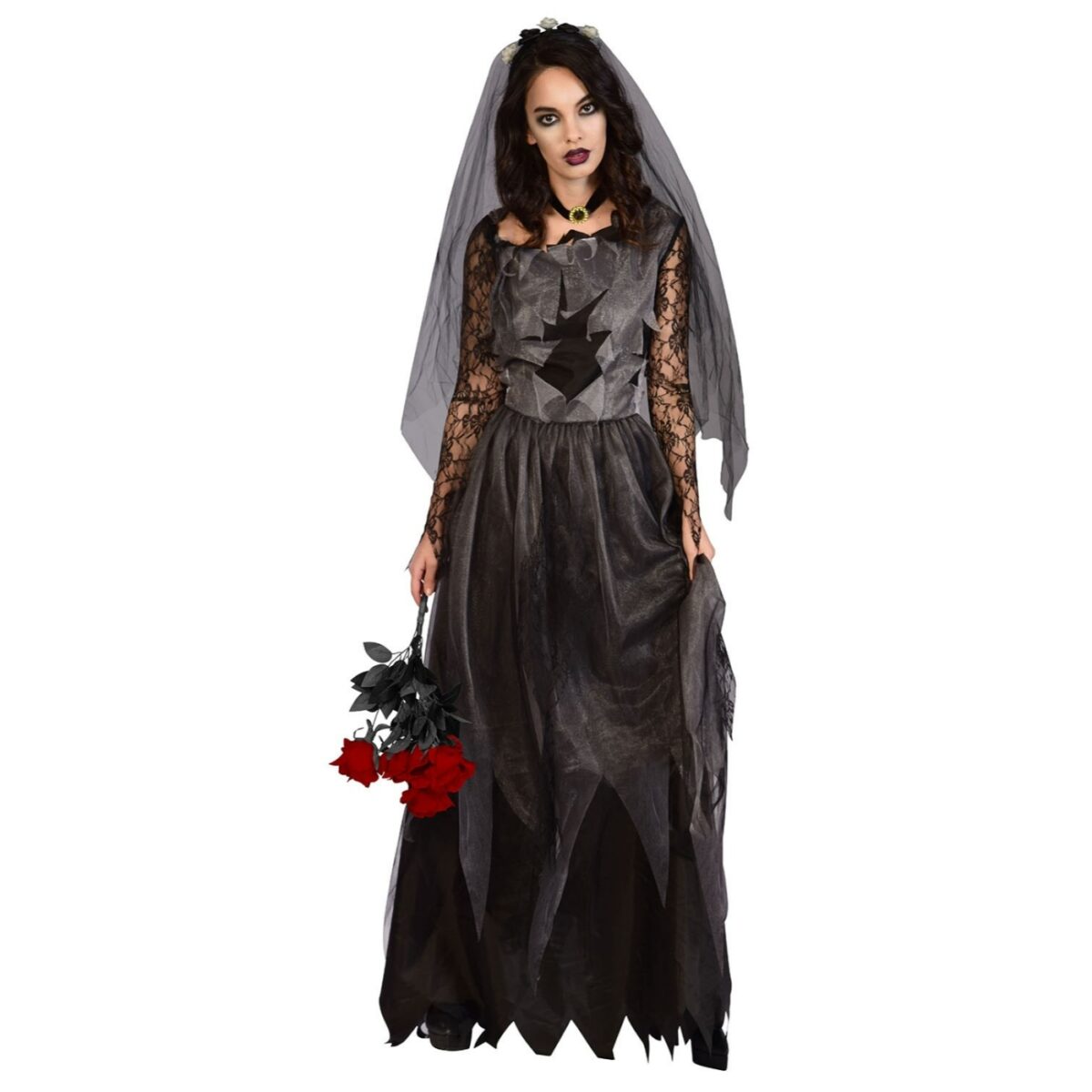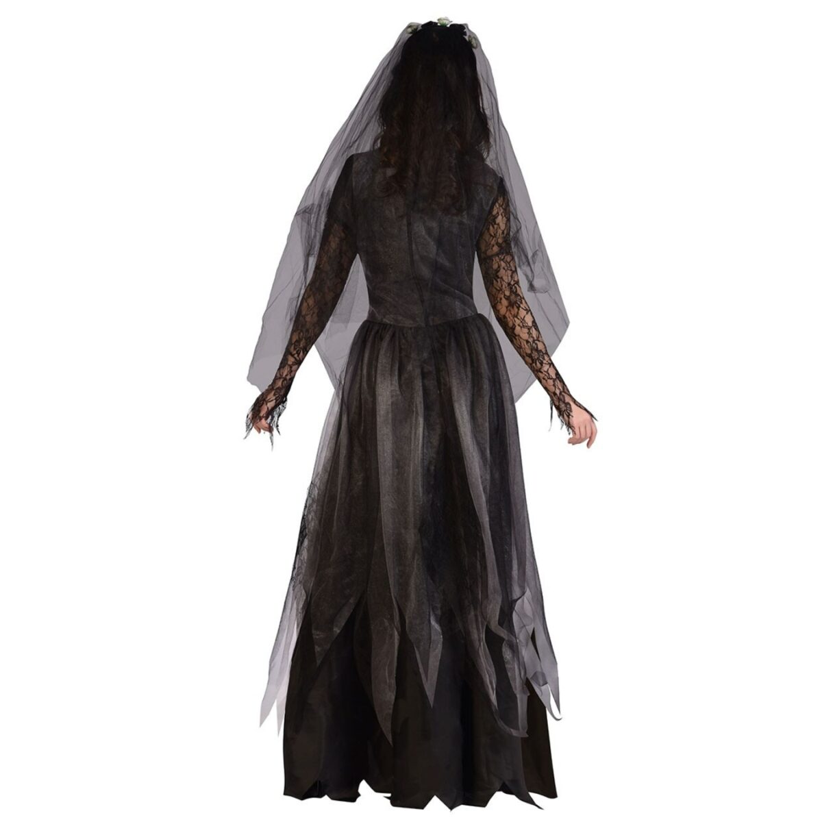 Γίνε η πιο ανατριχιαστική νύφη με αυτή την αποκριάτικη στολή “Copse Bride”, δημιουργώντας μια τρομακτική αλλά αξέχαστη εμφάνιση. Περιλαμβάνει ένα φαντασμαγορικό φόρεμα σε αποχρώσεις του μαύρου και του γκρι, με δαντέλα και σκισμένες λεπτομέρειες, καθώς και ένα σκουρόχρωμο πέπλο-στέκα. Προσθέστε στο look σας κι ένα τρομακτικό μπουκέτο λουλούδια και ετοιμαστείτε να παντρευτείτε τον αρραβωνιαστικό ζόμπι της επιλογής σας.