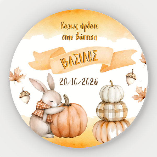 Αρχική » Είδη Βάπτισης » Βάπτιση με Θέμα » Βάπτιση θέμα Κολοκύθα » Στρογγυλή Αφίσα Βάπτισης Κολοκύθα με Λαγουδάκι