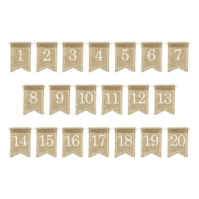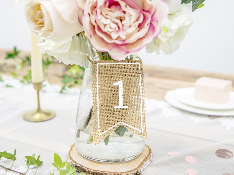 Σημαιάκι από γιούτα με λευκή εκτύπωση για μια πρωτότυπη αρίθμηση των τραπεζιών στη δεξίωση του γάμου, της βάπτισης ή της εκδήλωσης!