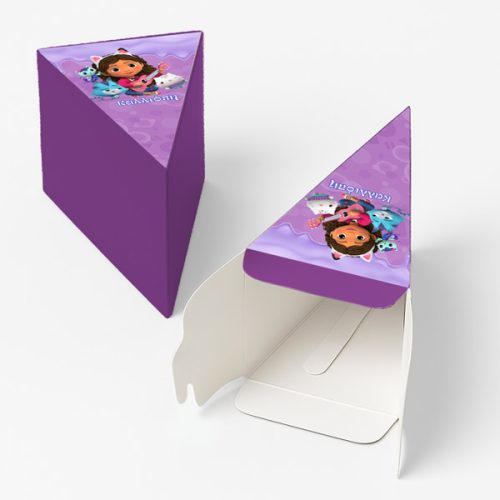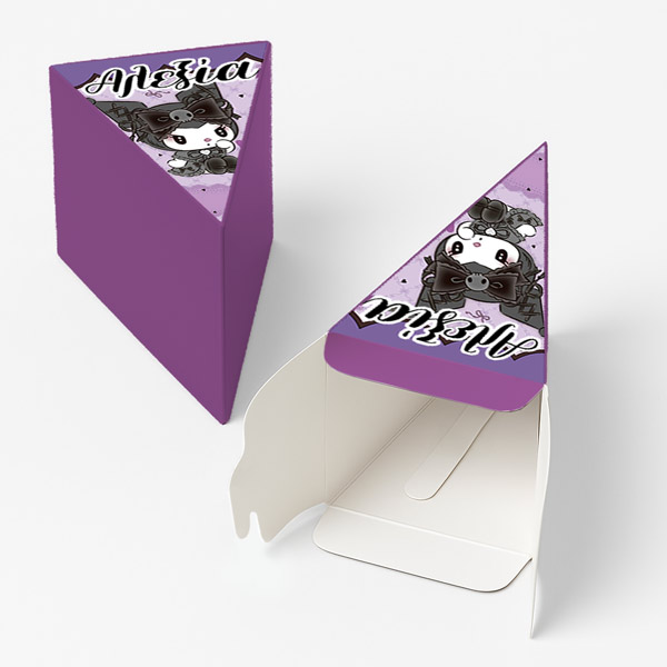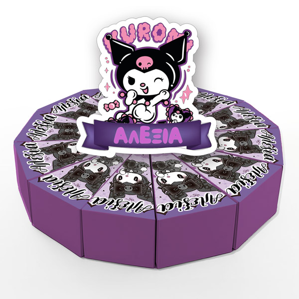 Χάρτινη τούρτα με θέμα Kuromi, με το όνομα του παιδιού & εντυπωσιακό design. Η χάρτινη τούρτα αποτελείται από 12 ξεχωριστά κομμάτια, τα οποία όταν συναρμολογηθούν σχηματίζουν έναν ολοκληρωμένο κύκλο – μια εντυπωσιακή παρουσίαση για κάθε είδους εκδήλωση. Κάθε κομμάτι είναι σχεδιασμένο σαν φέτα τούρτας και λειτουργεί ταυτόχρονα ως κουτάκι, ιδανικό για γλυκά ή μικρά δωράκια.